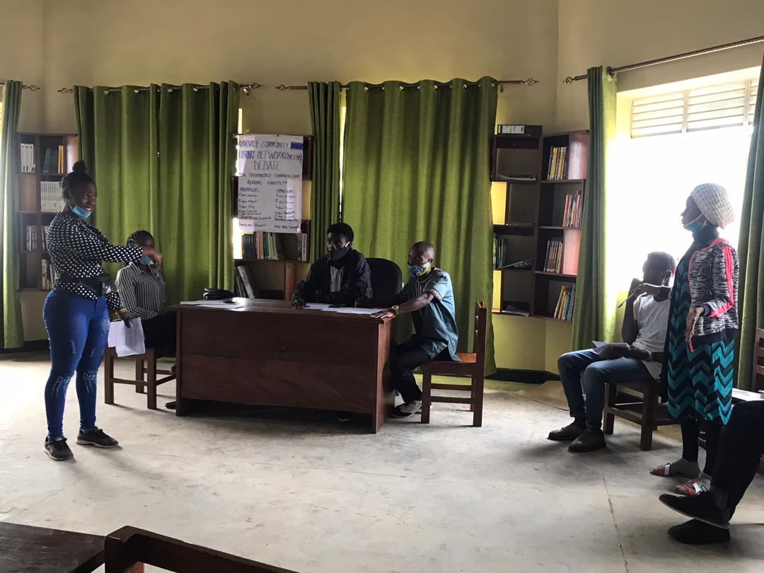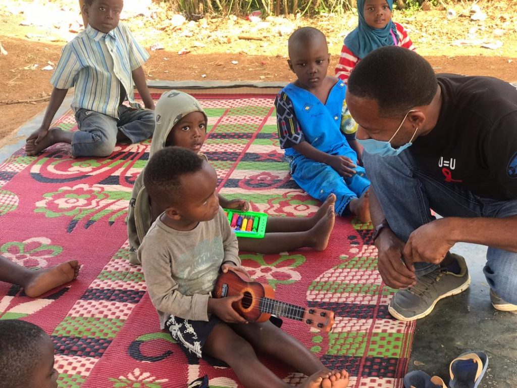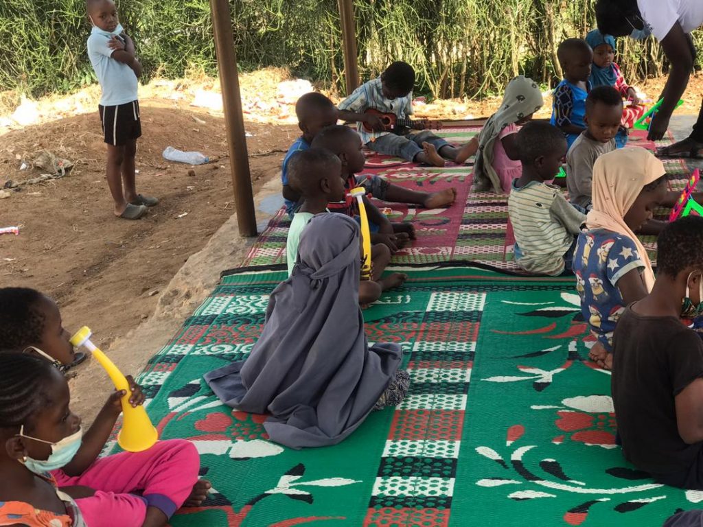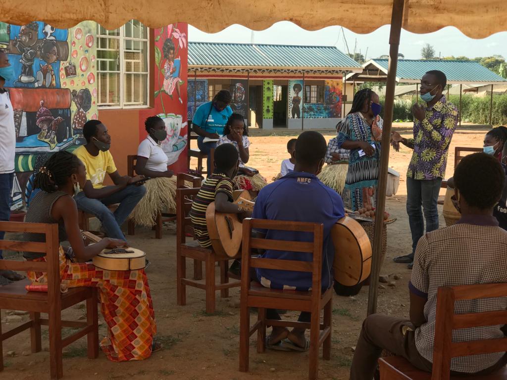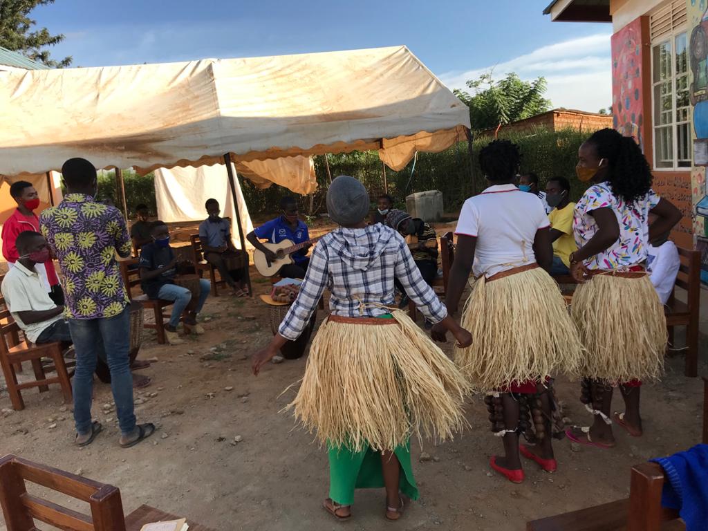 The talents of Nakivale’s residents so often goes untapped. That’s why we wanted to extend Library programming beyond literacy. Having already purchased instruments for the children’s library, next we set out to purchase locally made instruments for the adult library users. Here you can see a group of visitors gathering to try their hands at the instruments and dance to the music. These instruments will be also be used for plays and acting.