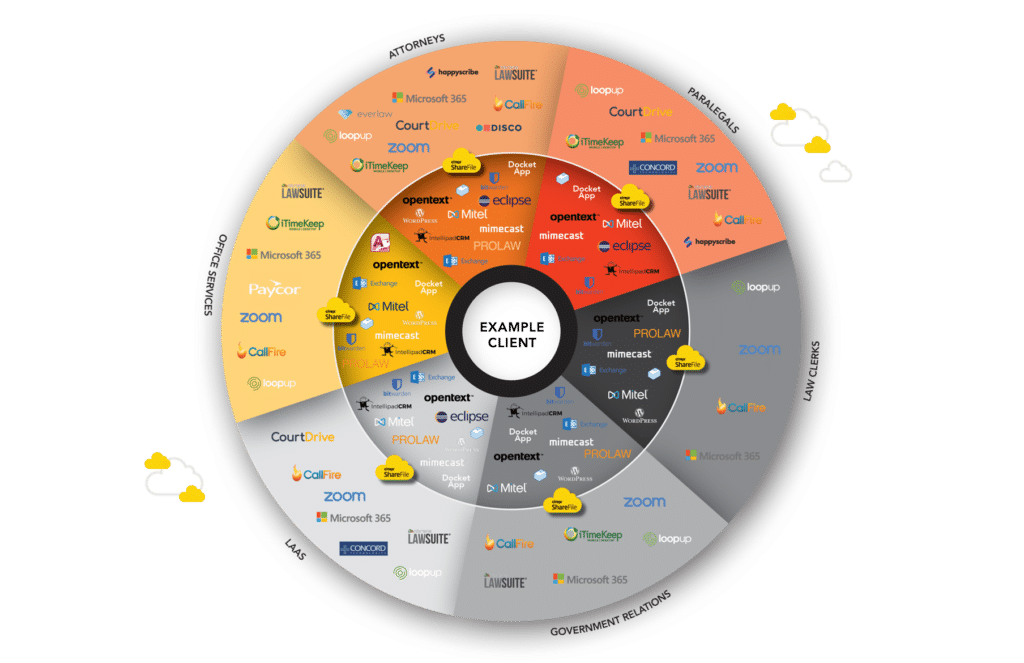 Risk assessments are no longer limited in scope to systems you control. With most businesses using cloud and Software as a Service tools, insurers are now including third parties as a part of your overall risk profile. Carriers want to make sure that you’re assessing your vendors and that they have an effective security program in place to protect your data. But before you can develop a proper vendor risk assessment policy, you need to truly understand who has access to your data. With the exploding usage of outside systems, the answer can sometimes be overwhelming. The below Data Map gives you an idea of the dozens of systems a 100+ person law firm uses in their daily operations.