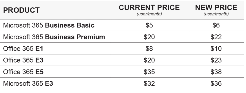 For the first time in nearly 10 years, Microsoft is rolling out substantive price increases for a many of their Microsoft 365 (formerly Office 365) packages. The following products are being increased: Microsoft 365 Business Basic, Microsoft 365 Business Premium, Office 365 E1, Office 365 E3, Office 365 E5, and Microsoft 365 E3.