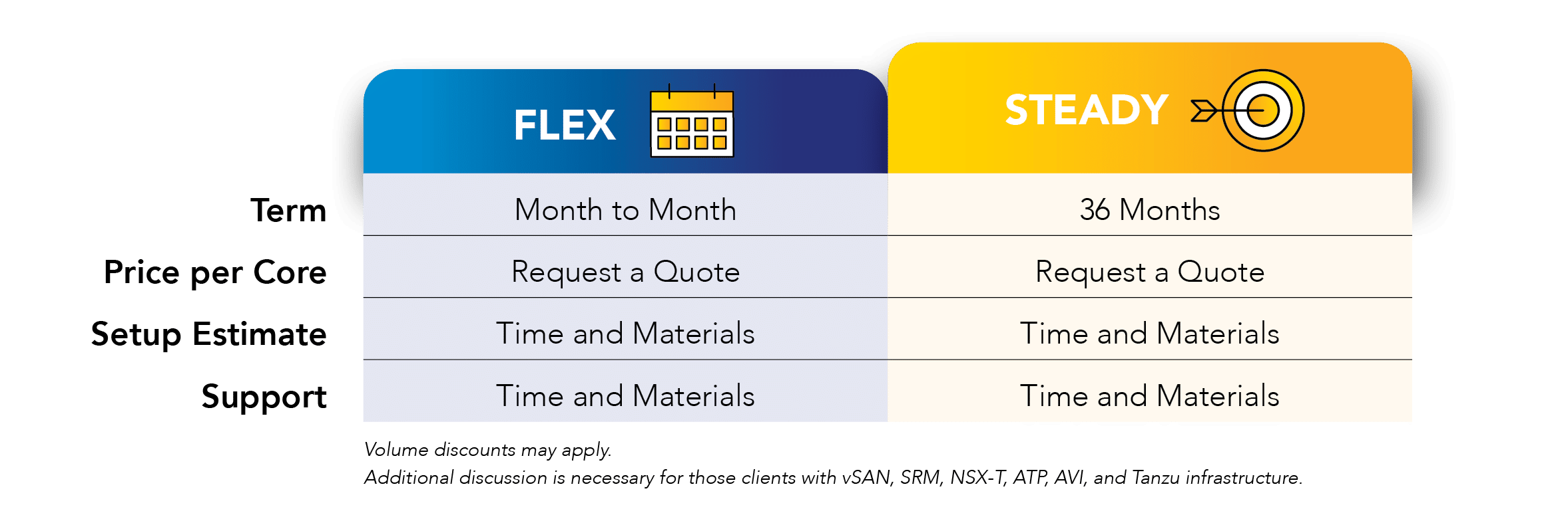 As an official Broadcom Premier Partner – VMware Cloud Service Provider (VCSP) and VMware Reseller for the United States market, Atomic Data is now offering two white label solutions for you and your clients’ VMware Cloud Foundation and add-on licensing needs. Introducing Flex and Steady plans, designed to bring continuity and security for your VMware workloads.